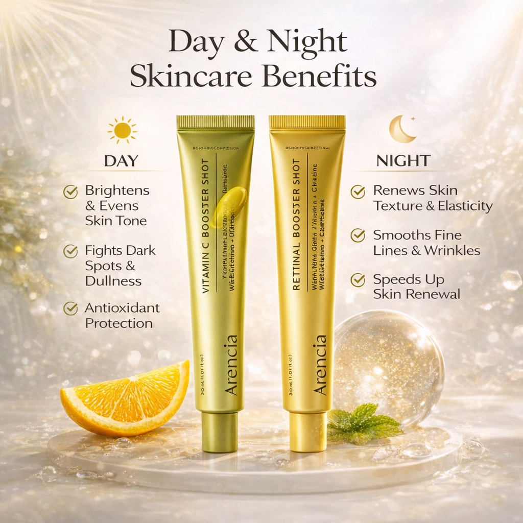 Arencia Day & Night Glow Duo is a complete skincare combo designed to brighten your skin in the morning and repair it at night.